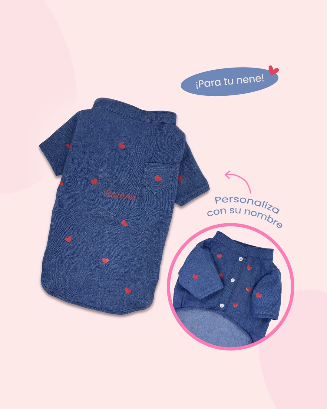 - 🐶 Para ellos: camisita denim con bolsillo + nombre estampado personalizado (¡díselo a mamá y se le caerá una lagrimita!).