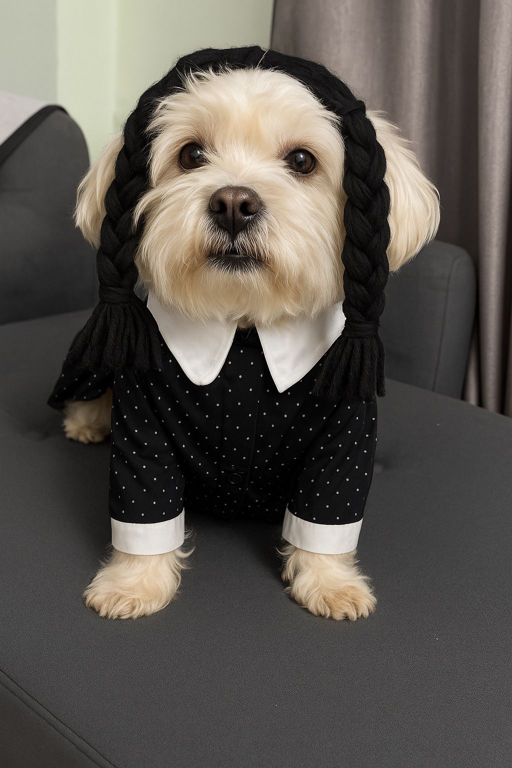 Elaborado en popelina de algodon con detalles en cinturon en cuerina incluye su peluca.